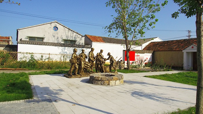 走进六营村,给人第一感觉是令人赏心悦目,不大的村子上,民宅墙壁上画着有关“乡村振兴”、“拥军拥属”和“庆祝中国共产党一百周年”等题材的宣传画,村中心的“双拥广场”上有长长的文化长廊,上面有介绍退役军人政策法规、“红色支部”以及当地革命烈土的事迹。广场中心建有一组“村民手推独轮车支前”的金色碉像,绿色的草坪分布于广场周边,共同营造一处富有文化气息的广场,所有的景观营造着“军爱民,民爱军,军民一家亲”的浓厚氛围。