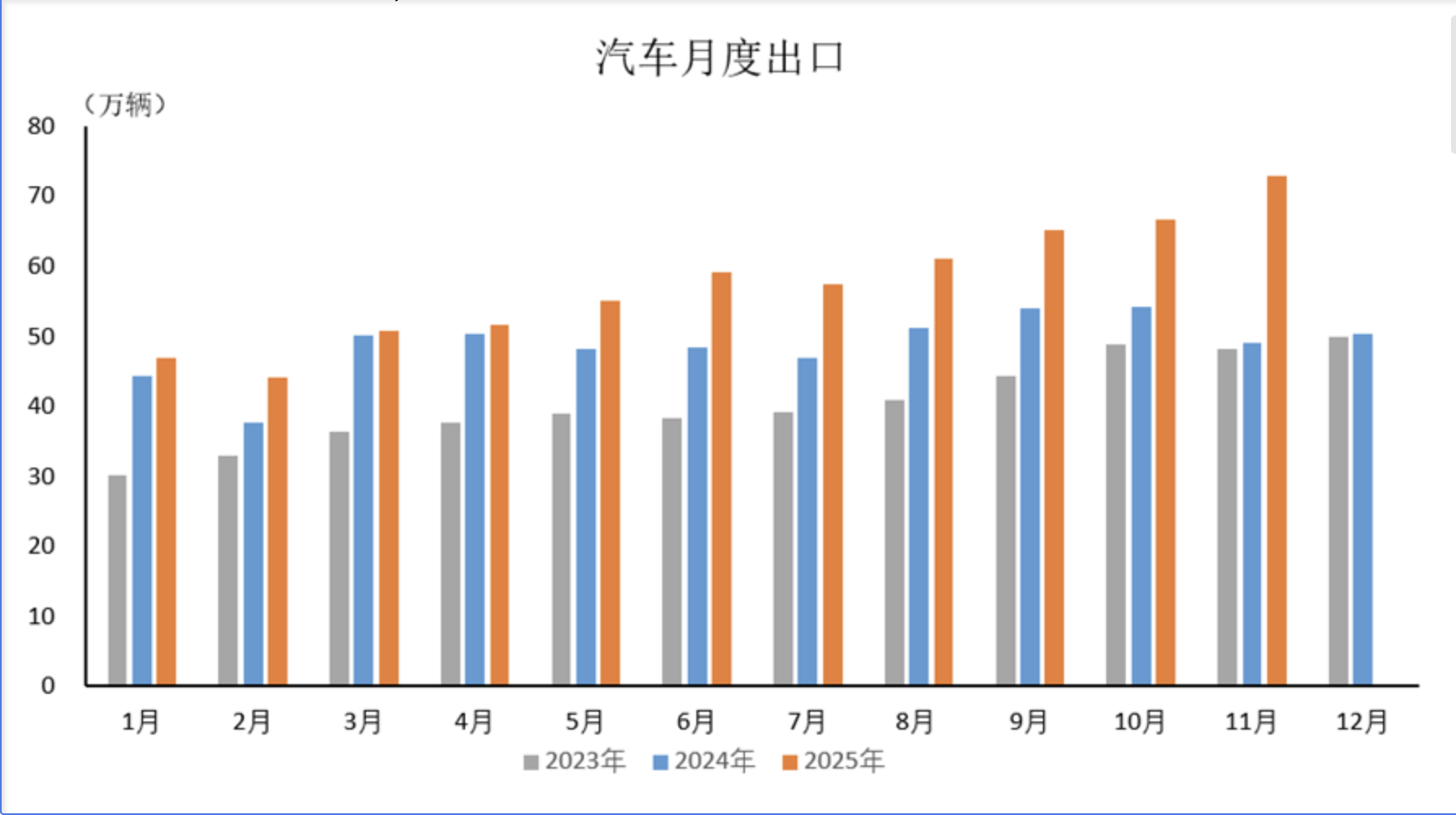 11月汽车出口为历史上首次超过70万辆,创历史新高