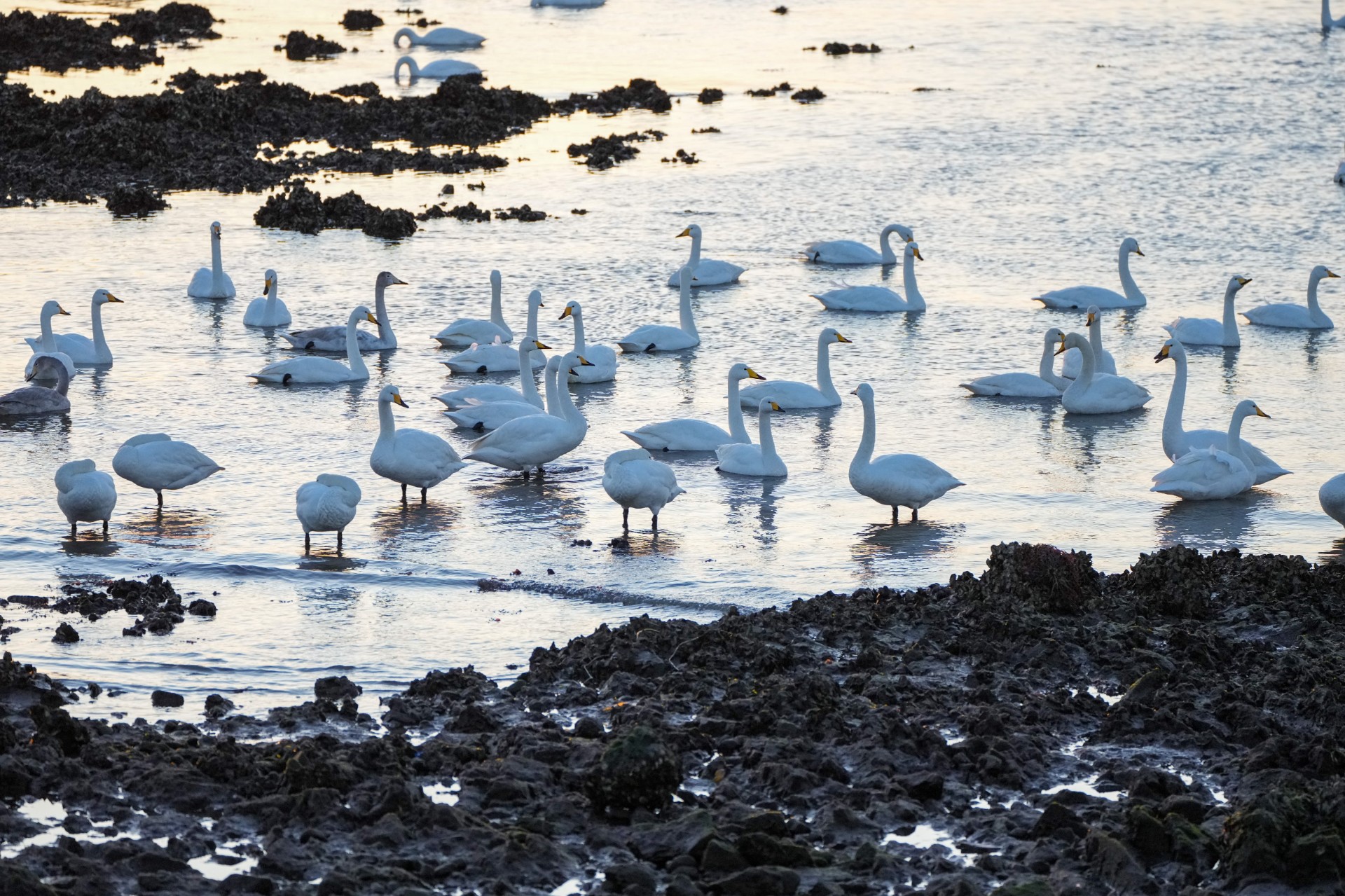 大批大天鹅在山东荣成越冬