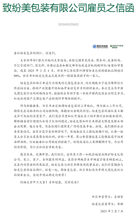 此次收购不仅是中国无菌包装行业“国产替代”进程的关键一步,也折射出乳业巨头伊利与蒙牛的间接博弈。新巨丰在2025年公司年会上以“互为星光,彼此照亮”为主题,强调双方整合后的协同效应,而纷美包装官网发布的《致员工信》则承诺保持独立运营,优化资源配置,共同打造“中国品牌走向世界”的行业标杆。尽管整合仍面临客户冲突、管理差异等挑战,但这场并购无疑为打破国际巨头垄断、重塑本土产业链提供了新的可能性。