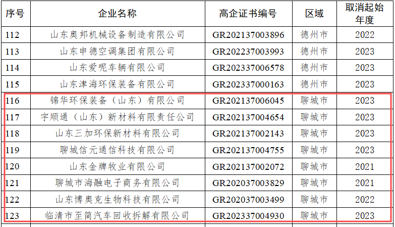 根据通知,此次聊城市被取消资格的企业具体为:锦华环保装备(山东)有限公司、宇顺通(山东)新材料有限责任公司、山东三加环保新材料有限公司、聊城信元通信科技有限公司、山东金牌牧业有限公司、聊城市海融电子商务有限公司、山东博奥克生物科技有限公司以及临清市至简汽车回收拆解有限公司,涉及环保装备、新材料、生物科技、电子商务、汽车回收等多个领域。