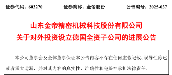 山东商报·山海新闻了解到,5月23日,山东金帝精密机械科技股份有限公司(以下简称金帝股份)发布公告,宣布其德国全资子公司金帝科技欧洲
