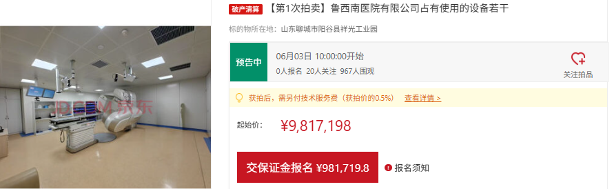 山东商报·山海新闻了解到,近日,鲁西南医院有限公司等两家公司管理人通过京东拍卖破产强清平台发布公告,拟于6月3日上午10时至6月4日上午