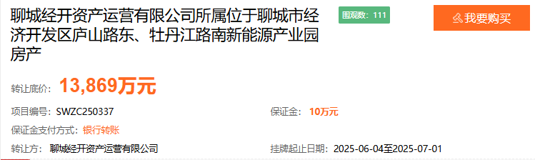 山东商报·山海新闻了解到,6月4日,聊城经开资产运营有限公司在山东产权交易中心平台挂牌转让其所属的聊城市经济开发区庐山路东、牡丹江路
