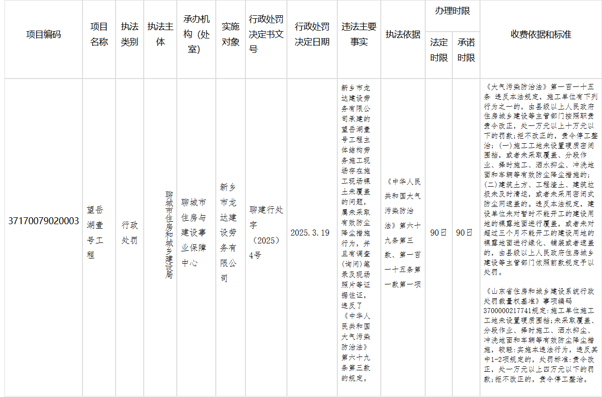 山东商报·速豹新闻了解到,近日,聊城市住房和城乡建设局发布行政处罚结果公示(2025第4期)。根据公示,新乡市龙达建设劳务有限公司承建的望岳湖壹号工程主体结构劳务施工现场因存在裸土未覆盖问题被查处。经查,该项目未采取有效防尘降尘措施,违反了《中华人民共和国大气污染防治法》第六十九条第三款规定,证据包括调查(询问)笔录及现场照片。依据《大气污染防治法》第一百一十五条第一项及《山东省住房和城乡建设系统行政处罚裁量权基准》(事项编码3700000217741),其行为属"较轻"情形,被责令改正并处以1万元以上10万元以下罚款,拒不改正将责令停工整治。