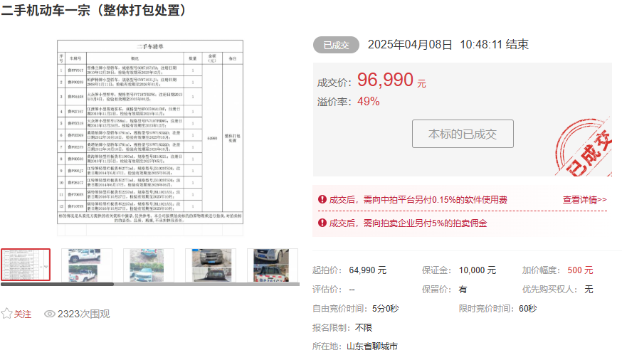 山东商报·山海新闻了解到,4月8日,山东诚信项目管理有限公司发布公告,河南王三汽车销售有限公司以9.699万元竞得聊城市中级人民法院、司法局等六家单位的12辆二手车,山东申正汽车拆解有限公司以5.939万元中标16辆报废车标的,两宗交易总成交额达15.64万元。