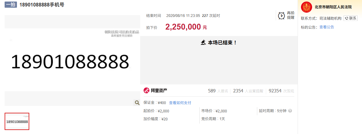 山东商报·山海新闻了解到,聊城市东昌府区人民法院将于5月6日10时至5月7日10时止(延时除外)在京东司法拍卖网络平台公开拍卖被执行人杨勇名下中国移动手机号码18761000000,该号码为六级靓号,起拍价6.68万元,保证金6000元,增价幅度1000元。此次拍卖采用设有保留价的增价方式,保留价与起拍价一致,需至少一人报名且出价不低于起拍价方可成交。
