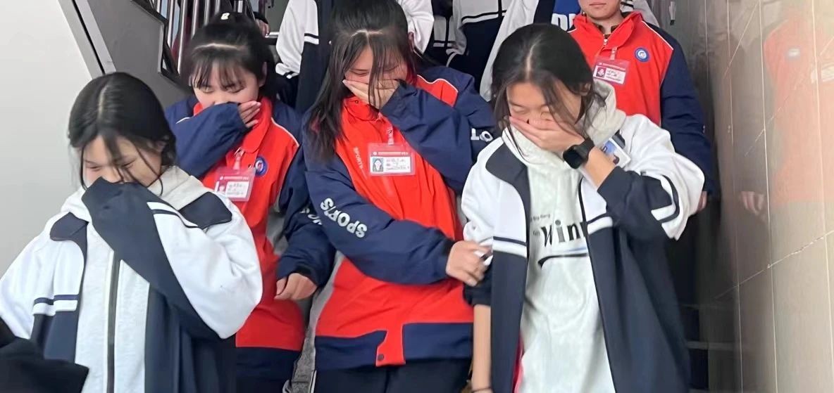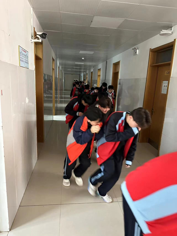 各宿舍能学会迅速组编成一队,按先后顺序向同一个出口撤离。为了提高撤离的速度,边撤离边组队,形成一个动态组队、撤离的局面。在逃生过程中,学生弯腰大步行走,不追跑、拥挤、推搡,同时用手帕或衣袖等捂住口鼻。各楼层的保护引导人员在楼梯口、转弯口等要指挥学生安全撤离,确保队伍的安全。
