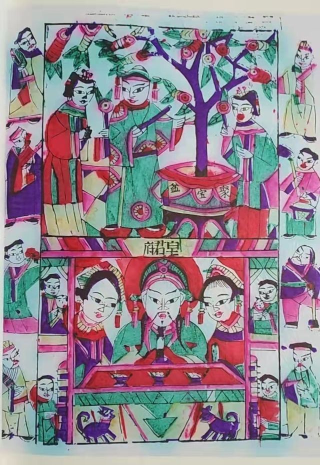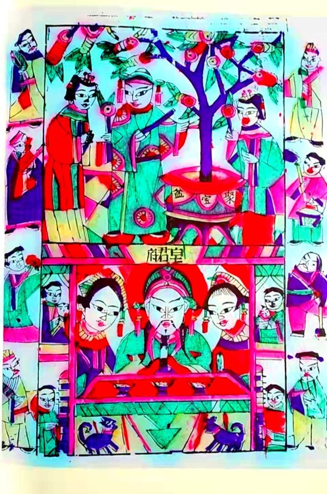 年画在中国民间是一种寓意吉祥的形象。在漫长的岁月里,随着年节风俗的演变而衍生形成的一种农耕社会特殊的象征性装饰艺术。年画,就是过年时张贴的画儿,因其源头可以追溯到二千多年前的门神,故也称“门神画”。到了晚清年间,“年画”一词才出现在李光庭的《乡言解颐》中,渐渐地统一替代了“画贴”“欢乐图”“画张”“纸画儿”等各地不同的称谓。年画在一开始是由匠人一张张地绘画而成的,效率极低。随着中国雕版印刷术的发明,年画木版刻印的工艺也随之得到发展。当时的山东有东昌府(今聊城)与潍县杨家埠两大民间画市,分别代表着山东木版年画的东西两大派系,在国内享有很高声誉。