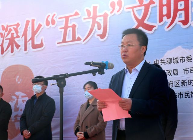启动仪式上,聊城市志愿者代表——全国学雷锋最美志愿者刘玉杰宣读了《聊城市“五为”文明实践志愿服务活动倡议书》。他向全市志愿者发出:“弘扬雷锋精神,争当文明实践志愿服务的引领者;深入基层一线,争当文明实践志愿服务的践行者;精准对接需求,争当文明实践志愿服务的推动者”的倡议。一花独放不是春,百花齐放春满园。他表示,在新的春天,新的起点,积极热情地投入“五为”文明实践志愿服务活动,为全市新时代文明实践志愿服务工作作出贡献,为建设富强、创新、开放、美丽、幸福、奋进的社会主义现代化新聊城提供强大的精神动力。