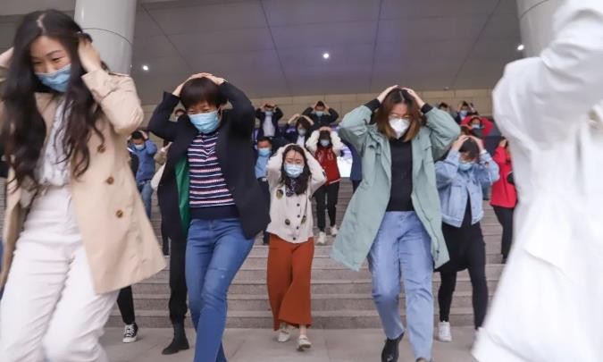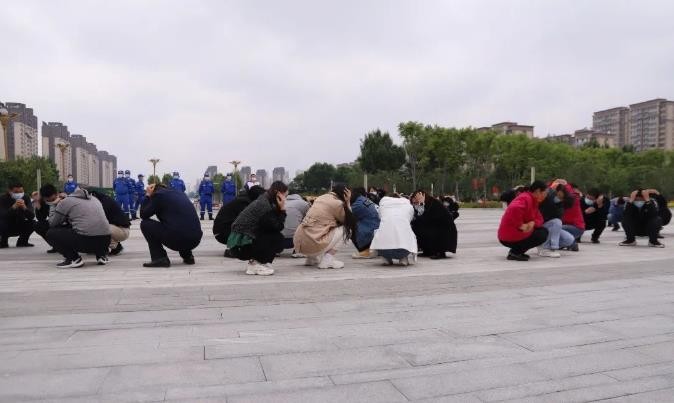 演练开始后,当听到地震紧急避险警报,集团员工就近避险,迅速抱头、闭眼,躲在桌子下,尽量蜷缩身体,降低身体重心,保护头部。在听到紧急疏散警报后,全体员工在蓝天救援队的指挥下,双手抱头,或用文件夹、笔记本等物品遮挡保护头部,快速有序的撤离办公场所,到达指定避险集结安全区域。