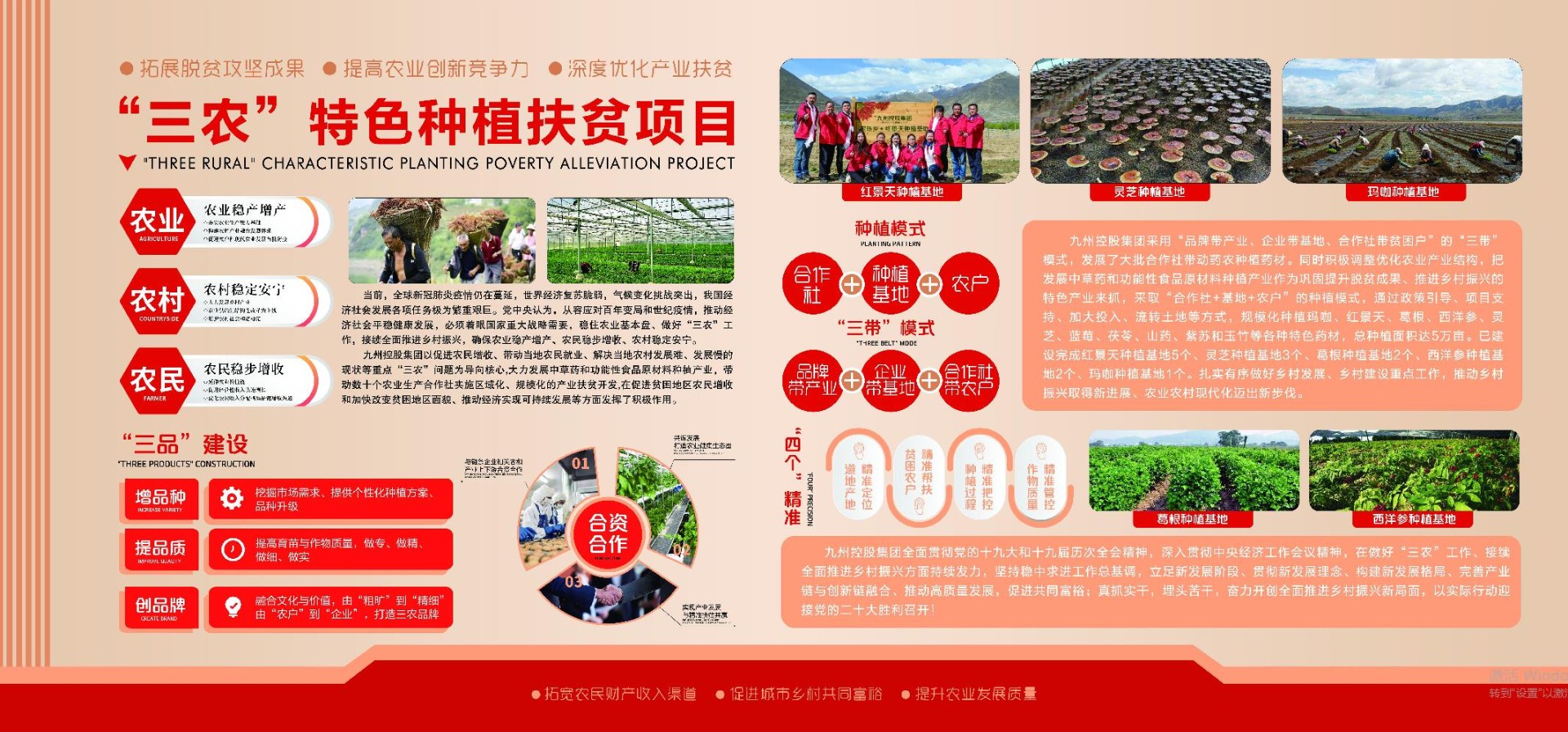 据刘钦松介绍,九州控股集团采用“品牌带产业、企业带基础,合作社带农户”的“三带”模式,发展了大批合作社带动药农种植药材。同时积极调整优化农业产业结构,把发展中草药和功能性食品原材料种植产业为巩固提升脱贫成果、推进乡村振兴的特色产业来抓,采取“合作社+基地+农户”的种植模式,通过政策引导、项目支持、加大投入、流转土地等方式,规模化种植玛咖、红景天、葛根、西洋参、灵芝、蓝莓、茯苓、山药、紫苏和玉竹等各种特色药材,总种植面积达5万亩。已建设完成红景天种植基地5个、灵芝种植基地3个,葛根种植基地2个、西洋参种植基地2个,玛咖种植基地1个。扎实有序做好乡村发展、乡村建设重点工作,推动乡村振兴取得新进展、农业农村现代化迈出新步伐。