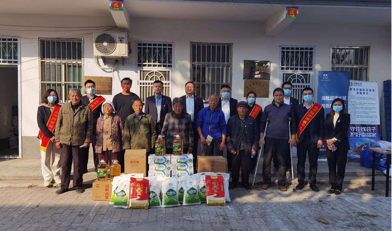 为全面落实上级主管部门部署安排和《集团乡村振兴实施意见》,秉承央企情怀,强化使命担当,2022年10月21日,太平财险聊城中支主要负责人李振设带领党员、业务骨干等一行八人,赴聊城冠县桑阿镇段菜庄村开展走访慰问,送金融知识进乡村活动。