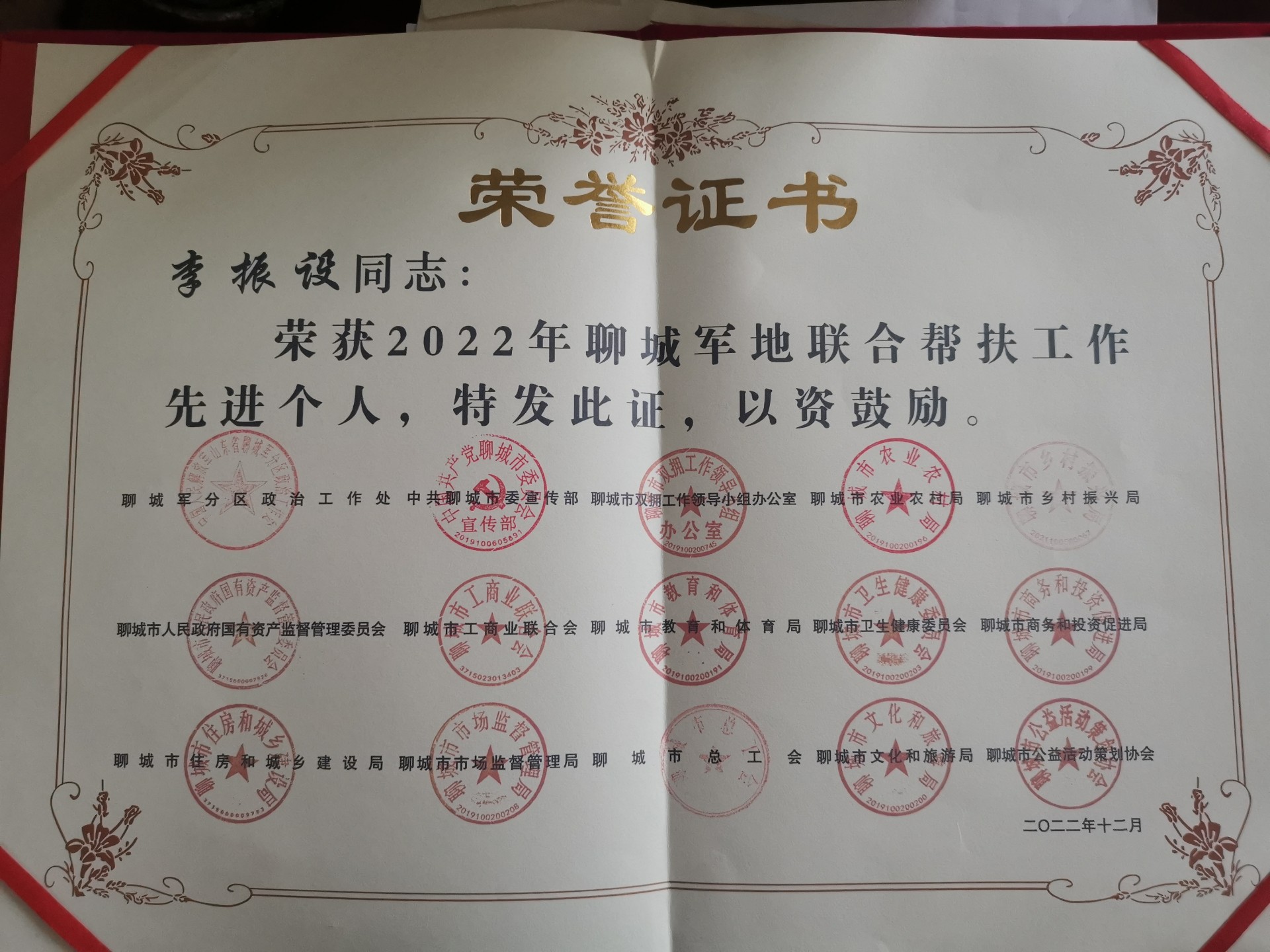 近日,太平财险聊城中支被授予“军地联合帮扶先进单位”荣誉称号,中支负责人李振设总被评为“军地联合帮扶先进个人”。