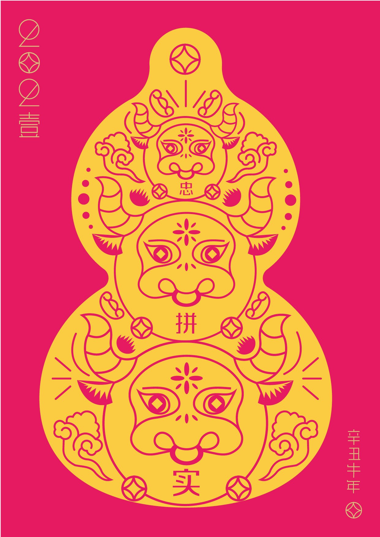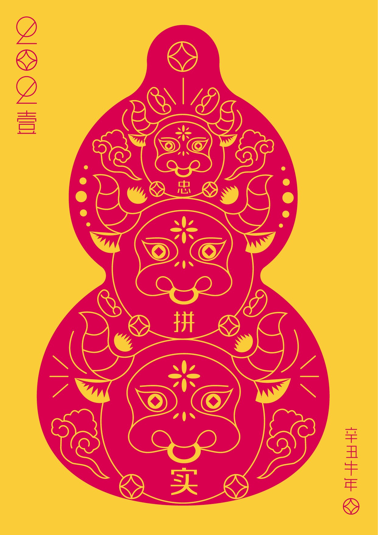 作品中三头叠起来的牛分别代表了“为民服务孺子牛、创新发展拓荒牛、艰苦奋斗老黄牛”孺子牛精神在于“忠”:甘当人民公仆 维护群众切身利益。拓荒牛精神在于“拼”:不断学习 不断提升。老黄牛精神在于“实”:踏踏实实干好工作。葫芦的形状中三头牛叠在一起,分别代表了“忠、拼、实”三个字。葫芦也有“福禄”的谐音,既代表了2021牛年有福禄,同时祝福传达了发扬“三牛精神”,在保持艰苦奋斗的同时,自觉发扬党的优良传统,牢固树立实事求是精神和务实作风,脚踏实地,真抓实干,兢兢业业干事,踏踏实实做人。期待人们的生活“犇”向幸福的美好祝愿。
