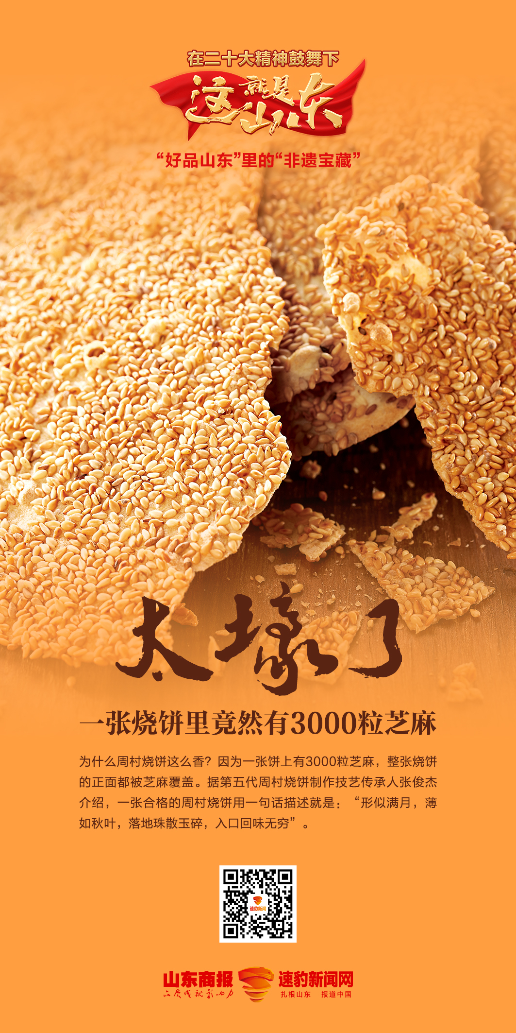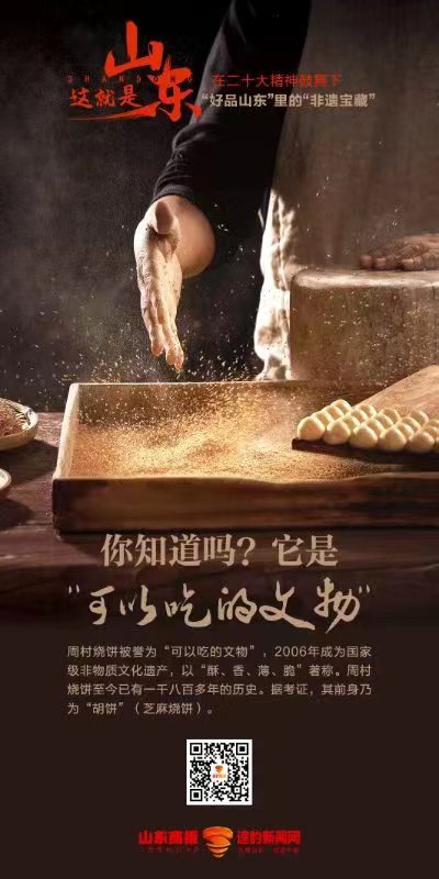 "好品""非遗"双向加持,让"山东力量"格外亮眼跟随“好品山东”里的“非遗宝藏”网络主题活动的脚步,山东大地上一个个“好品”兼一项项非遗技艺,跨越时空跃然眼前。 周村烧饼“记”艺:一张烧饼上近3000粒芝麻“团团如月麻如星,星月和酥燮理成。”自汉时从西域传来,烧饼作为中华传统小吃,备受各地老百姓的喜爱。随着时间发展,烧饼也划分出烤饼、芝麻烧饼、大酥烧饼、油酥烧饼等多种类型。 周村烧饼“记”艺在山东,提起大酥烧饼,很难不令人想到蜚声海内外的“周村烧饼”。作为老字号品牌,周村烧饼历史悠久,其手工制作技艺入选国家级非物质文化遗产代表性项目名录、第一批“好品山东”品牌名单。近年来,紧跟时代发展步伐,周村烧饼在产品结构升级和技术创新方面不断发力,聚焦“两创”新生,成为具有鲜明特色的地域性文化品牌,向着新的征程不断迈进。 |